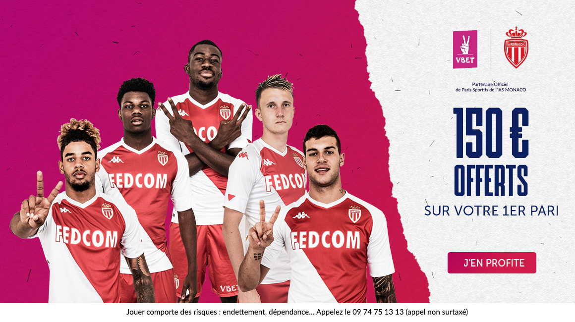 Ce partenariat se matérialisera notamment par la pose du logo magenta de VBET sur le short du club lors des deux prochaines saisons, soit jusqu’en juin 2022. Et pour fêter cet accord avec l’AS Monaco et le retour de la Ligue 1, VBET propose à tout nouvel inscrit sur la plateforme de paris sportifs, de bénéficier d’un bonus pouvant atteindre jusqu’à 150€ offerts sur votre premier pari*.