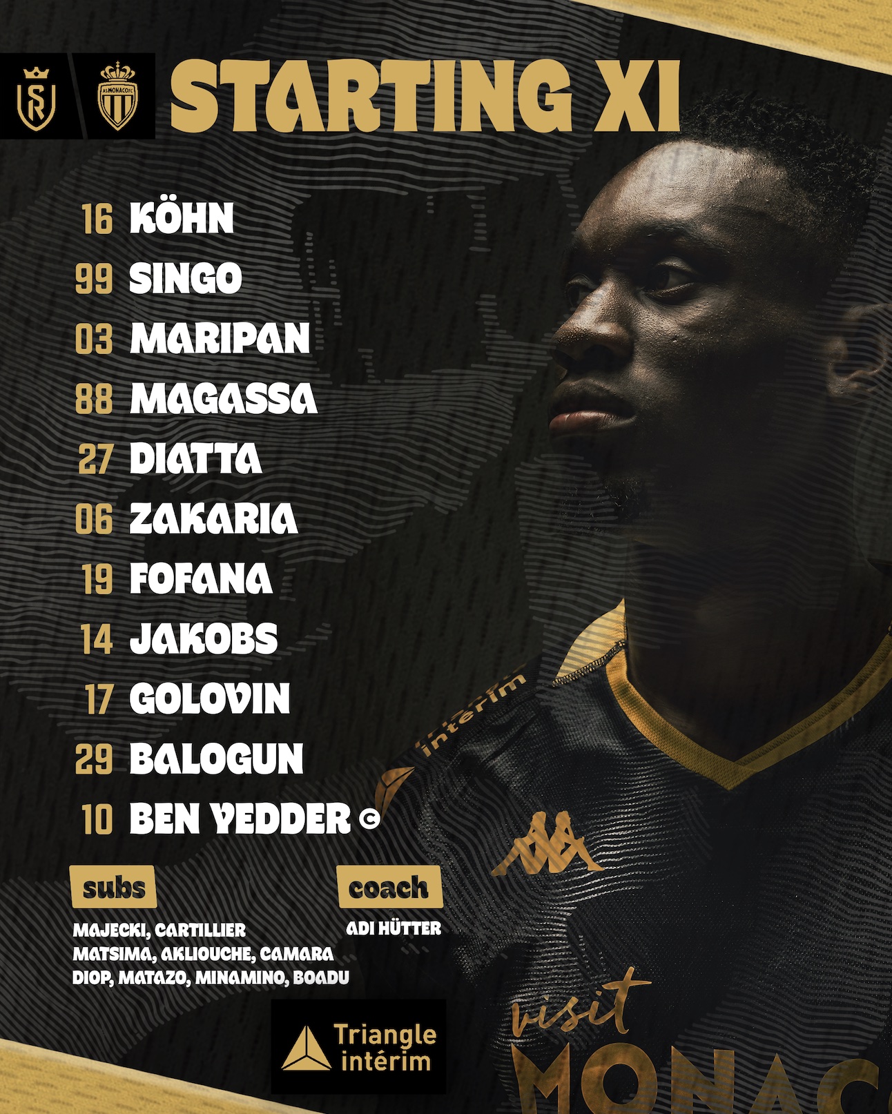 «Монако»: Кён — Синго, Марипан, Магасса (Матсима, 46′) — Диатта, Фофана (Камара, 90′), Закария, Якобс — Головин (Минамино, 73′) — Бен-Йеддер ©, Балогун (Аклиуш, 82′)