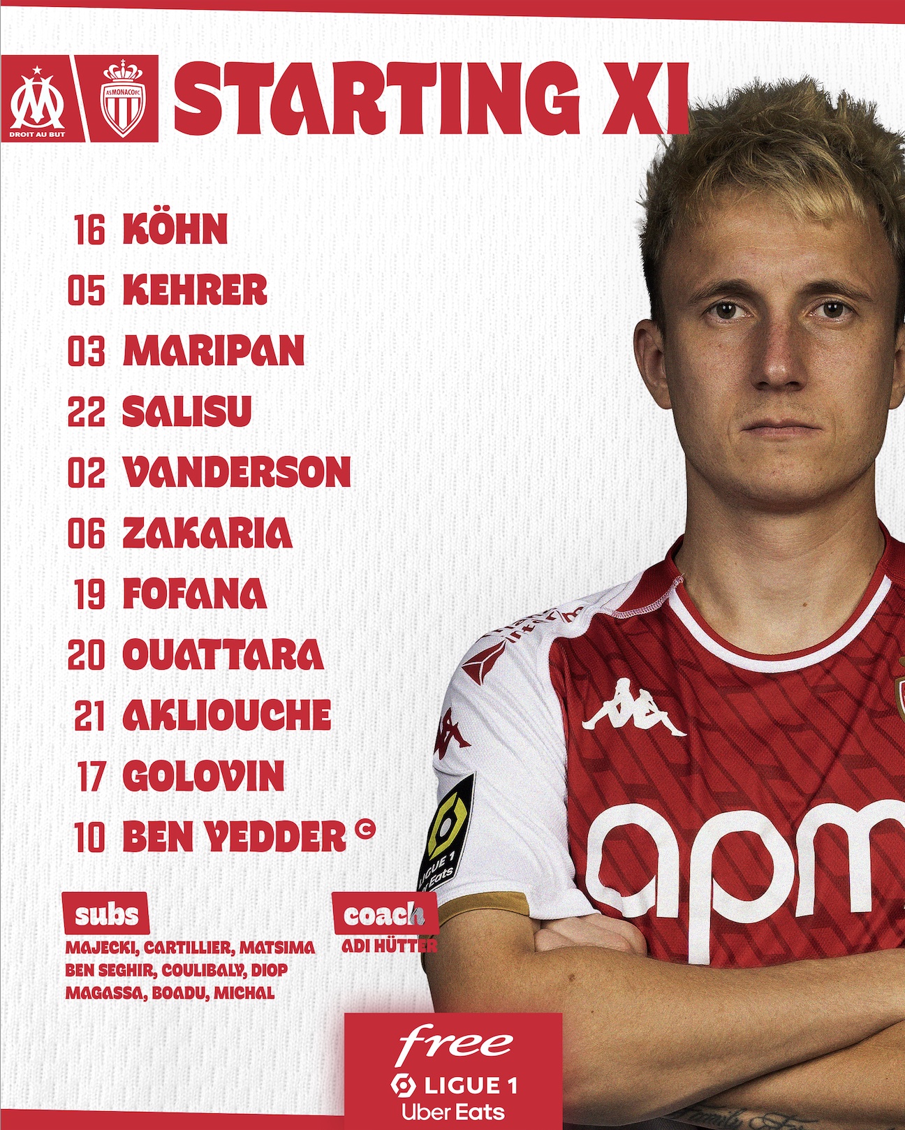 К игре 19-го тура чемпионата, как и к предыдущим январским встречам, монегаски подошли в усеченном составе. Из игроков, которые отправились защищать цвета своих сборных на КАН и Кубке Азии, к игре с «Марселем» успел вернуться лишь Мохаммед Салису. Ганский защитник с первых минут расположился в центре обороны вместе с Тило Керером и Гильермо Марипаном. В свою очередь Денис Закария сыграл в паре с Юссуфом Фофана в опорной зоне, а Александр Головин и Манес Аклиуш заняли свои места под Виссамом Бен-Йеддером, сыгравшим на острие.