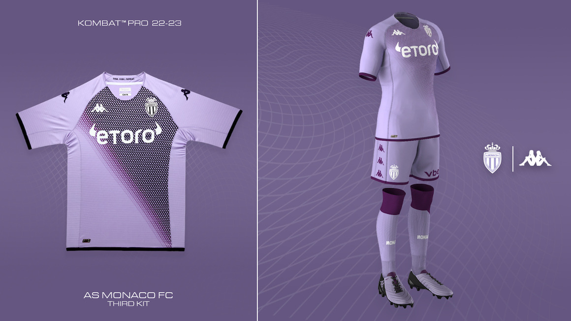 В четвертом сезоне подряд Kappa® и «Монако» тесно сотрудничали, чтобы создать футболку, которая сочетает в себе ДНК идеологии RISE.RISK.REPEAT., бренд «Монако», элегантность княжества и идентичность клуба. Игроки смогут воспользоваться всеми преимуществами новой футболки KOMBAT™ PRO 2023 с технологией Kombat Pro System, являющейся творением фирмы Kappa, которая гарантирует крайне высокий уровень прочности и эластичности материала, а также отличается бесподобными дышащими свойствами ткани.