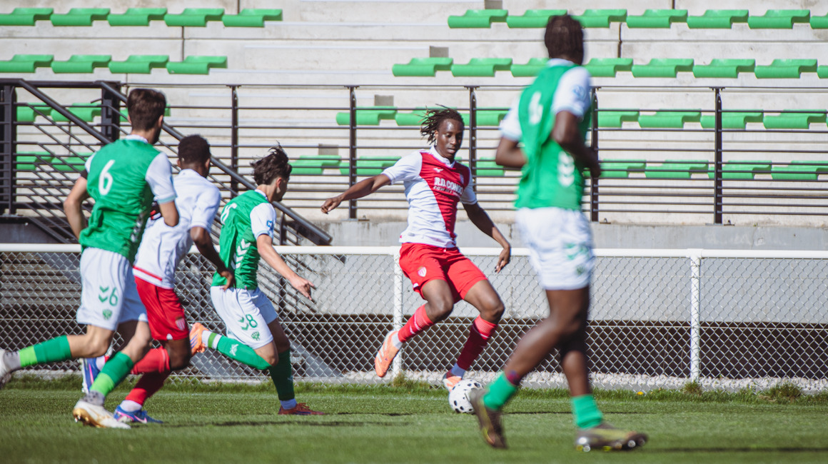 Alors que le combat entre les deux équipes se déroulait principalement au milieu de terrain, il fallait attendre la 19e minute pour assister à un nouveau débordement d’OUmar Konaté sur l’aile gauche. Cette fois-ci son centre en retrait parvenait jusqu’à Joan Tincres, mais ce dernier ne trouvait pas le cadre. Les Verts répondaient par un raid de Retour Rayan Aït Amer qui lui aussi ne se montrait pas assez précis face au but monégasque. Dans un premier acte assez fermé, les locaux privilégient un jeu de transition et tentaient de bousculer la défense rouge et blanche à coup d’attaques rapides. Il n’y parvenaient pas et les deux équipes rejoignaient les vestiaires sur ce score nul et vierge à la pause.